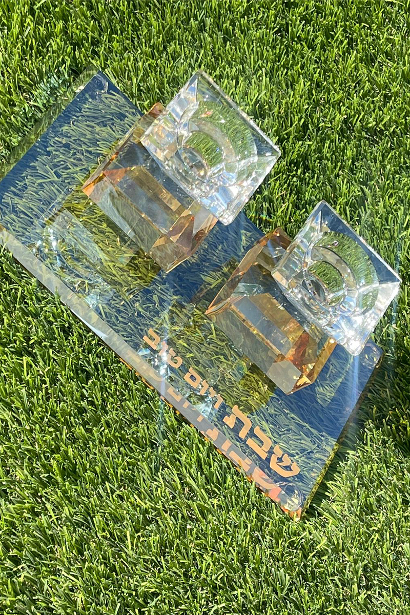 / פמוטים ומגש מהודרים קריסטל זהב